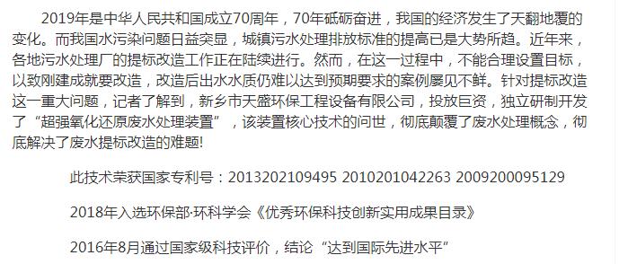 中國高新技術網發(fā)布:《關注:解碼科技創(chuàng)新》——新鄉(xiāng)市天盛環(huán)?!俺瑥娧趸€原廢水處理技術”